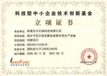2005年8月,公司承擔(dān)了科技部中小企業(yè)技術(shù)創(chuàng)新基金立項(xiàng)資助的“高分子固態(tài)鋁電解電容器專(zhuān)用生產(chǎn)設(shè)備”研發(fā)項(xiàng)目,并于2007年12月順利通過(guò)了科技部專(zhuān)家組的考核驗(yàn)收。