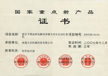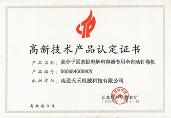 2006年11月,我公司“高分子固態(tài)鋁電解電容器專(zhuān)用全自動(dòng)釘卷機(jī)”獲得江蘇省高新技術(shù)產(chǎn)品證書(shū)。